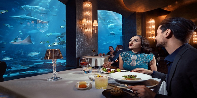 رستوران اوسیانو در هتل آتلانتیس پالم در کنار آکواریوم ۱۱ میلیون لیتری با ۶۵ هزار جانور دریایی قرار دارد. یک میز در کنار شیشههای این آکواریوم رزرو کنید و یکی از رمانتیکترین تجربههای دبی را داشته باشید. در همان حال که کوسهها و سفرهماهیها را تماشا میکنید، سرآشپز گرگوار برگر برایتان یک منو کامل از غذاهای خوشمزه و متفاوت آماده میکند.